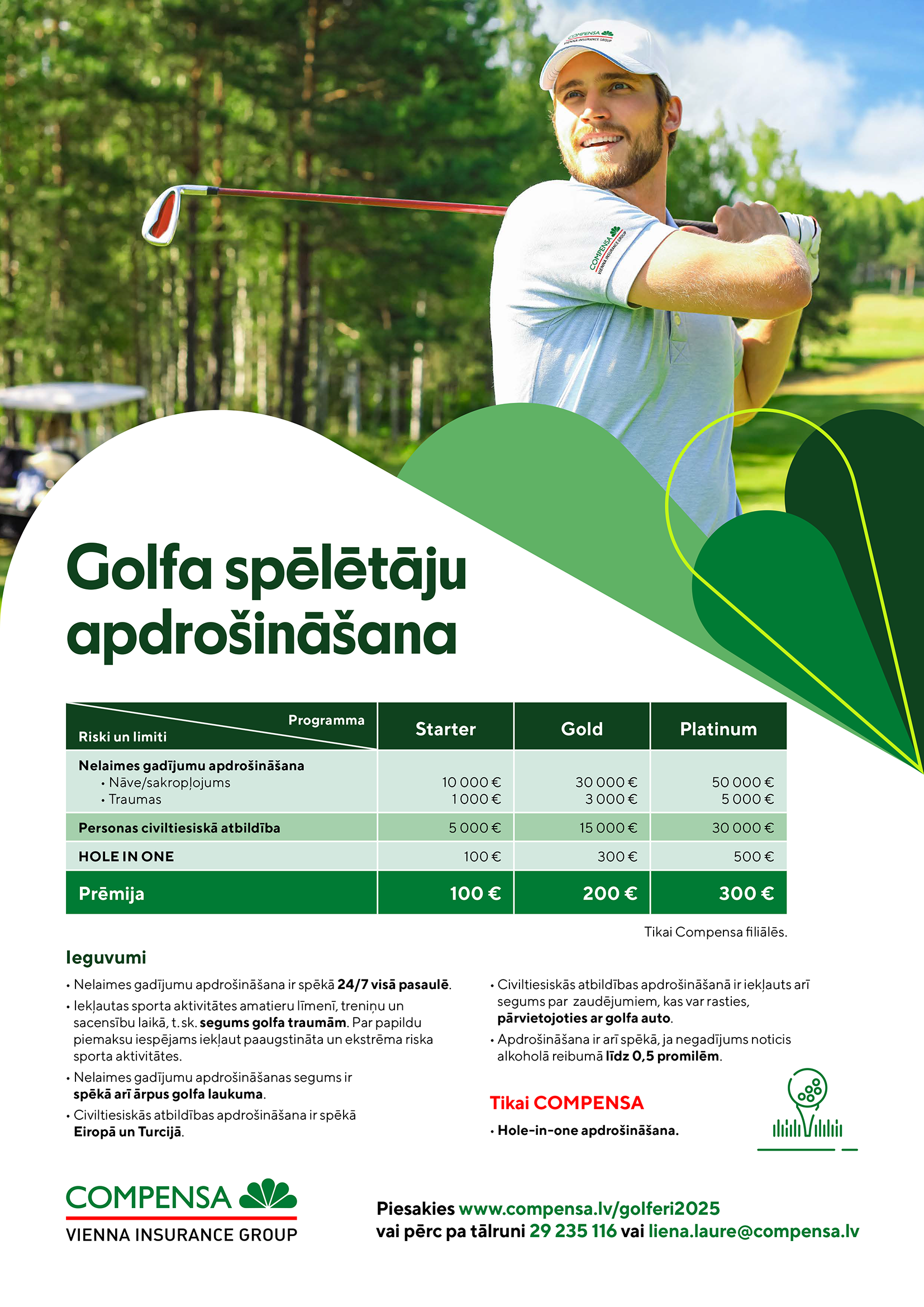 Compensa ir izstrādājusi īpašu programmu golfa spēlētājiem, piedāvājot nelaimes gadījumu un civiltiesiskās atbildības apdrošināšanu.