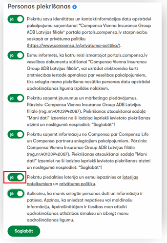 2. Piekritis saņemt Compensa jaunumus un mārketinga piedāvājumus un piekritis saņemt informāciju no Compensa par Compensa Life un Compensa partneru sniegtajiem pakalpojumiem,